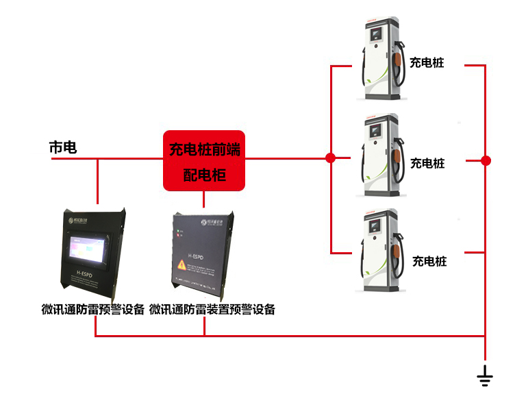 輝和科技云充電樁防雷防護、接地過雷電流診斷、預警系統(tǒng),在充電樁配電柜前端加裝微訊通防雷預警設備,通過內部的局域網(或無線網絡)通道上傳至云端監(jiān)控中心進行集中處理,以此監(jiān)測站內充電樁防雷設施的工作狀態(tài)、雷擊次數、SPD是否老化等,保障站內防雷設備正常工作,避免安全隱患。